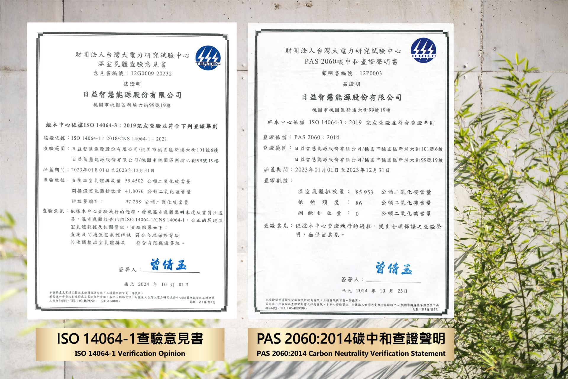 相較一般企業僅止於完成溫室氣體盤查與查證,日益智能率先以國際標準ISO 14068 的要求,明確界定組織排放類別且完成查證,並依「減量優先、抵換補足」原則,透過碳權抵換達成完整碳中和,成為台灣首家且連續兩年獲得第三方碳中和認證的能源服務商,榮獲台灣大電力頒發碳中和證書。